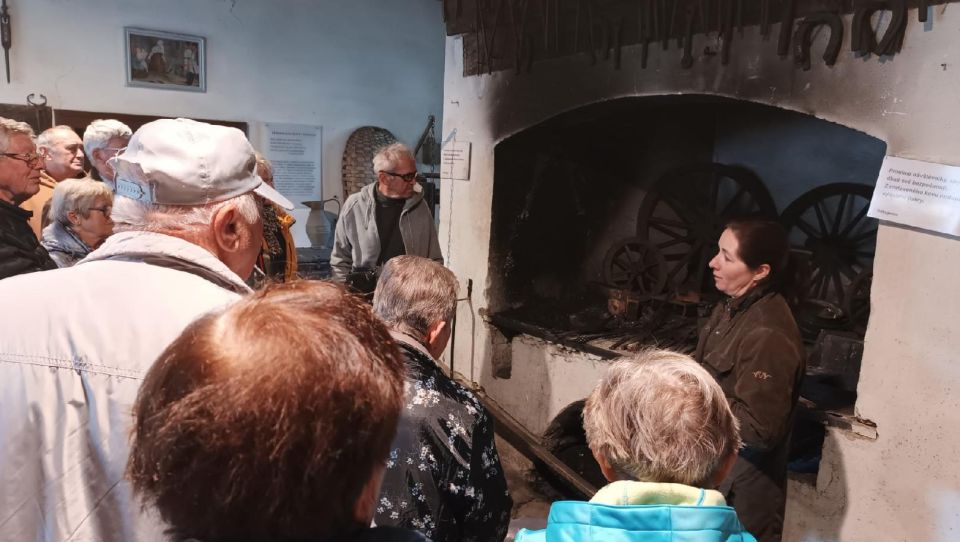 Následoval výborný oběd v restauraci Maryša. Odtud vedly naše kroky do Kovárny Těšany. Těžiště tvoří kovářská dílna. Tvoří ji dvou ohnišťová výheň s dvěma původními měchy, širokým otevřeným komínem, kovadlinou, kovářským ponkem, náčiním. Vedle je kolářská dílna s odpovídajícím nářadím, kuchyň, sváteční jizba. Paní průvodkyně vsunula mezi výkladem nějaké zajímavosti, ať již o Maryši, nebo další zajímavosti.