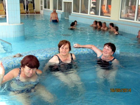 Dne 16. 6. 2014 jsme uskutečnili zájezd do termálních lázní Mošoň, Maďarsko. Ve známém areálu nás přivítalo hned několik bazénů s různě teplou vodou. V každém bazénu byly různé trysky, hřiby, někteří odvážlivci nechali na sebe dopadat vodu z výšky, z různých chrličů. Návštěvnost v lázních nebyla velká, takže se dalo úspěšně relaxovat, cvičit i plavat. Teplá voda dopomohla k rozcvičení ztuhlých kloubů. Sluníčko nám svítilo, takže jsme přijeli opálení. Kávička, nebo babský mls samozřejmě nesměl chybět. Jedinou skvrnkou na krásném dni byl úraz paní ing. Teplé. Ještě, že nešlo o nic závažného, při cestě k domovu jsme ji vyzvedli v nemocnici. Přejeme brzké uzdravení bez komplikací.