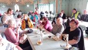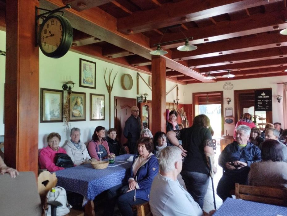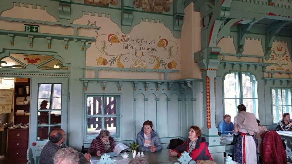 Z mlýna jsme popojeli jen kousek do restaurace Balita, kde jsme měli objednaný oběd – smažený kuřecí řízek, brambory, polévka. V Trojanovicích vystoupilo 13 členů, kteří vyjeli na Pustevny lanovkou. Zbytek pan Dufek vyvezl autobusem. Nádherné Jurkovičovy stavby Libušín a Maměnka nás vítaly. Na architektonickém návrhu Libušína a sousední Maměnky začal Jurkovič pracovat již v roce 1897. Slavnostně byla otevřena roce 1899. Na výzdobě se podílel i Mikuláš Aleš. V roce 2014 vyhořela chata Libušín, v roce 2020 už zase byla uvedena do provozu. Jídelna v Libušíně je naprosto nádherná. Strop i stěny jsou pokryty nádhernou malbou. Při kafíčku a frkále jsme obdivovali výzdobu chaty Libušín.